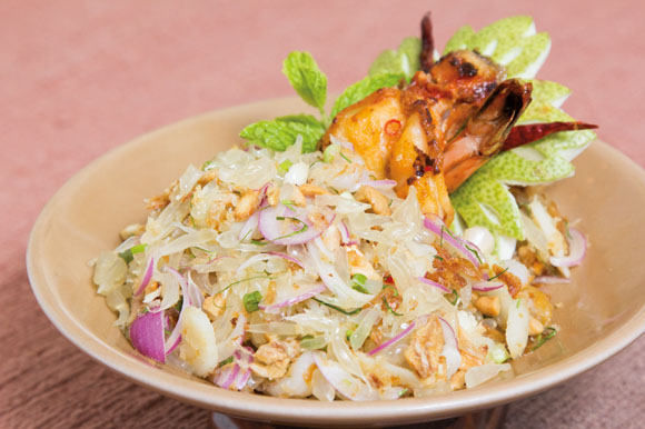 エビや揚げニンニク、揚げ玉ねぎ、カシューナッツなど10 種類以上の食材とざぼんを混ぜ合わせている。塩気の多い食材が多いので、ざぼんのフルーティーさを生かしながらも「おかず」として楽しめる。