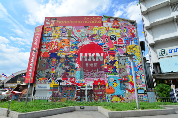 ハデハデな香港面(香港ヌードル)の外壁側面の壁画