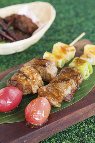 試食の一品目は屋台方式で竹の棒に挟んで提供される「ガイヤーン・セープ・バー」。オリジナルのほか、ウコンとレモングラスで味付けした3種類があり、少しずつ風味が異なる。どれもジューシーで柔らかく、食べやすい。