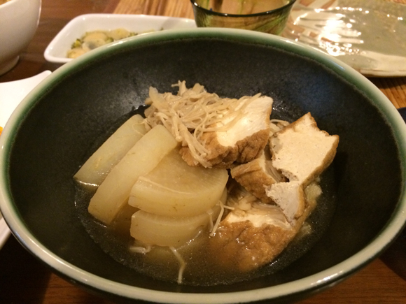 大根と厚揚げの味付けは薄めだけど、お出汁の香りがするような…。聞いたらすこーしナムプラー(魚醤)を入っていました。
