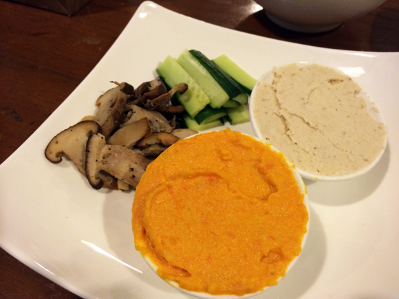 ニンジン味とキノコ味。これをパンに塗り、その上に薄切りのキュウリやキノコを乗せていただきました。