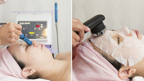 リラックスできたところで、次は顔のクレンジングへ。ブラシを使ってゆっくりと丁寧に汚れを落としていき、それが終わるとオゾンスチームと毛穴吸引スポットでニキビケアに移ります。肌を温めて毛穴が開き切ったところで、「アクアピーリング」に突入です。