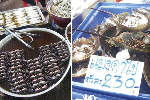 値段 買った魚の単価(実際に買った値段):アジ140B/kg(5匹138B)、カツオ120B/kg(1匹180B)、エビ370B/kg(1 kg分約15匹くらい)、巻き貝(ホイ・ワーン)150B/kg(1kg分)、イカ250B/kg(1kg分3杯)、炭火焼き費用:1種類30B(エビ30B、巻き貝30B、イカ1杯20B)
