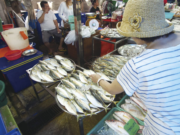 タイの市場によくあるような生臭さがなく、日本の鮮魚店のような新鮮な魚介の匂いに溢れていた。野菜やシーフード用ソースも売られているので、ここですべてが完結するのもいい。ときどき氷売りや卸売りが声を荒げながら通路を走ってきて、客が避けてあげなければいけない。そんな市場ならではの喧噪も楽しい。