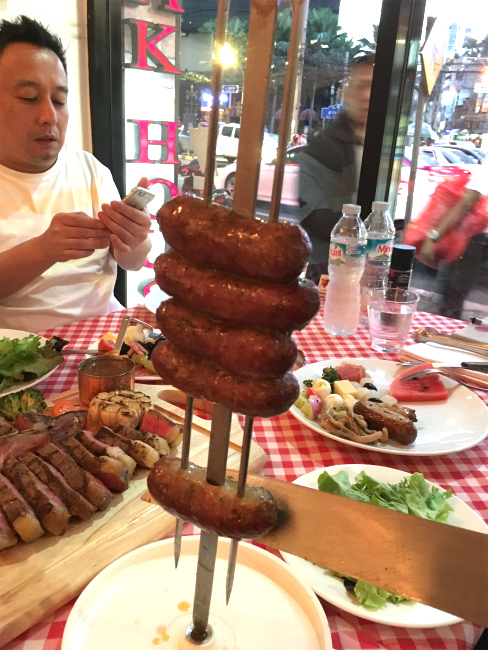 それをシェフが各テーブルまで来て、一枚一枚切り分けていくのです。ちなみにこちら、スクムビット通り沿いの路面店なのですが、シェフがシュラスコを切る度にギャラリーが足を止めて、その様を観察していきます。宣伝効果抜群やがな。