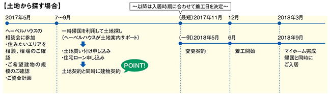 今回は平均的な家づくりのスケジュールということで、『すでに日本に土地がある方』と『土地探しから始める方』の2パターンに分けて見ていきましょう(下の図を参照ください)。