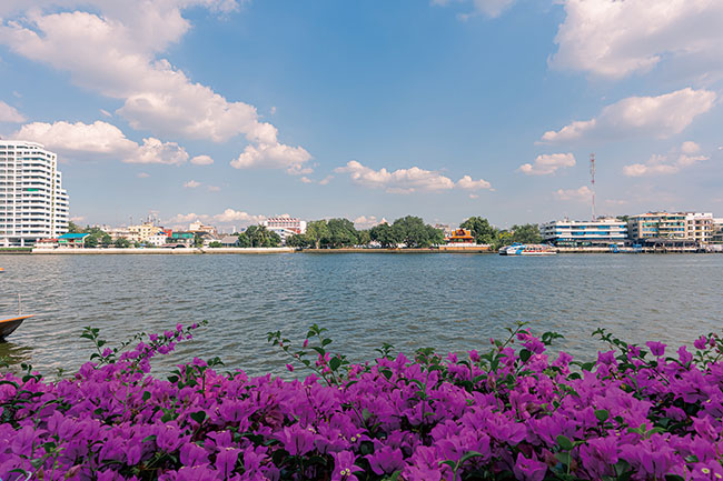 店の場所は、ラマ8世橋を望むチャオプラヤー川沿いの一角。訪問者を歓迎するように植えられた紫の花と青空が気持ちいい