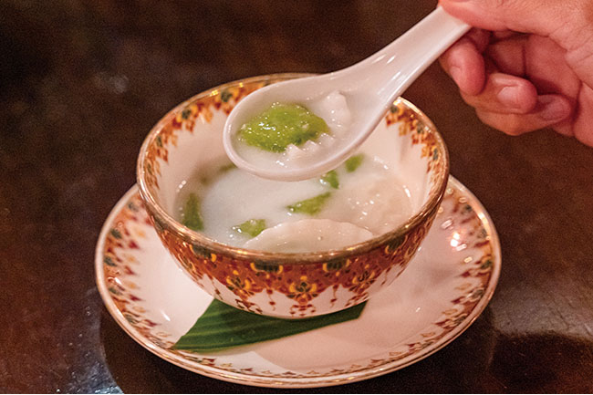 アユタヤ時代から食べられている稀少なタイスイーツ「カノム・インタニン(180B)」。特製のパンダン(タイ料理によく用いられる葉)スイーツに、ココナッツの果肉&ミルクを合わせています