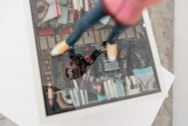 人形の作品についても、内部の図書館のような空間は自分の頭の中を表現しています。本棚に収まっている本はすべて、過去に開催した展覧会のフライヤーやDMなどを使って制作しました。