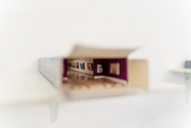 スパゲッティの空き箱を覗き込むと、ディテールまでこだわって作り込まれたミニチュアの美術館が広がっている。作品自体の小ささからは想像もつかない、鏡の反射を巧みに使って創出されたどこまでも続く空間に、吸い込まれそうな感覚になる---。