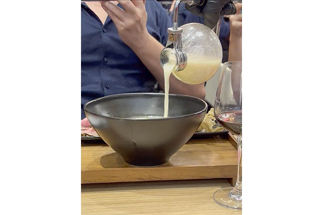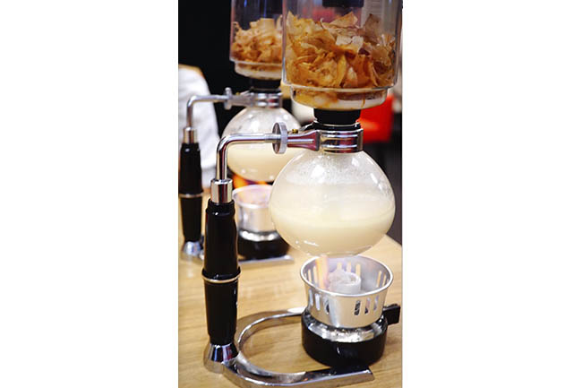 席に着くと、まず目の前に登場するのは鰹節が入ったサイフォンです。サイフォンの下から火を入れると、フラスコの中の豚骨スープがじわじわと上昇し、鰹節の旨みが引き出されていきます。調理を見ながらの4分間の待ち時間は、期待感が高まる楽しいひとときです。